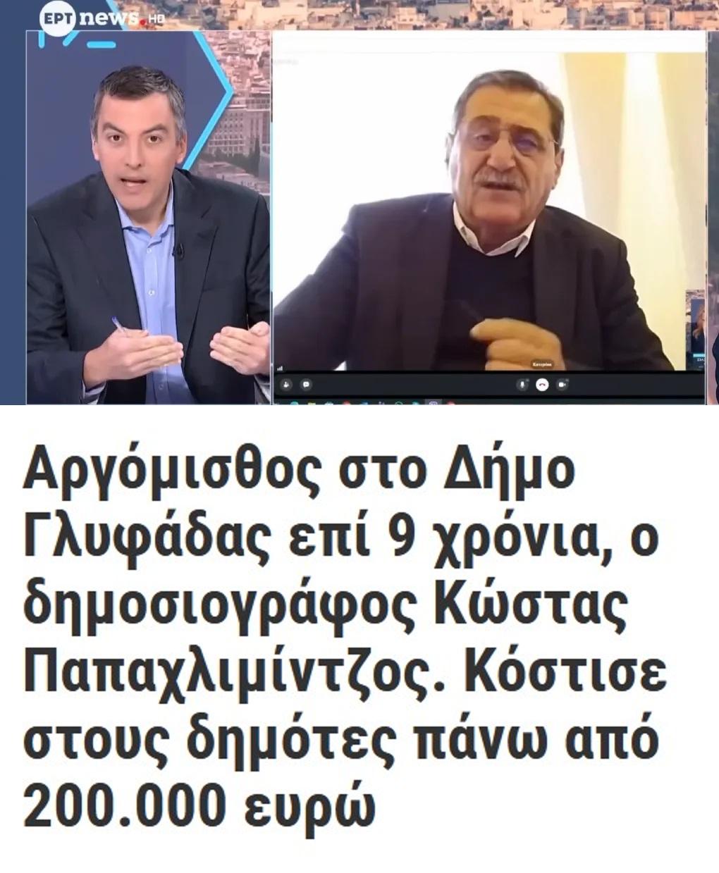 Οπως ανέφερε τότε ανάρτησή μας ο δήμαρχος Γλυφάδας κ. Παπανικολάου πλήρωνε επί 9 χρόνια ανελλιπώς κι όχι βέβαια από την τσέπη του, αλλά με χρήματα των Γλυφαδιωτών, τον «παλιόφιλο» από την εποχή που ήταν φοιτητές στη ΝΟΜΙΚΗ και «ίδρωναν μαζί τις φανέλες» της ΟΝΝΕΔ, δημοσιογράφο κ. Κώστα Παπαχλιμίντζο, ως εργαζόμενο μετακλητό υπάλληλο στο Δήμο!!!”.