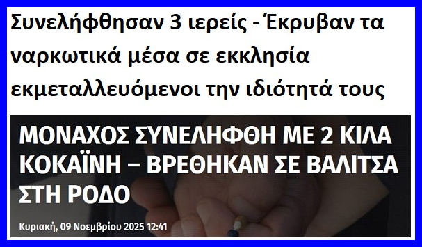 Σήμερα η αστική ειδησεογραφία μας σερβίρει ένα ακόμα επεισόδιο από τη σειρά «Ιερή Υποκρισία – Season 2025». Τρεις παπάδες συνελήφθησαν να κρύβουν την ηρωίνη που εμπορευόταν σε εκκλησίες, εκμεταλλευόμενοι την… ιδιότητα τους, και ένας μοναχός πιάστηκε με 2 κιλά κοκαΐνη σε βαλίτσα στη Ρόδο.