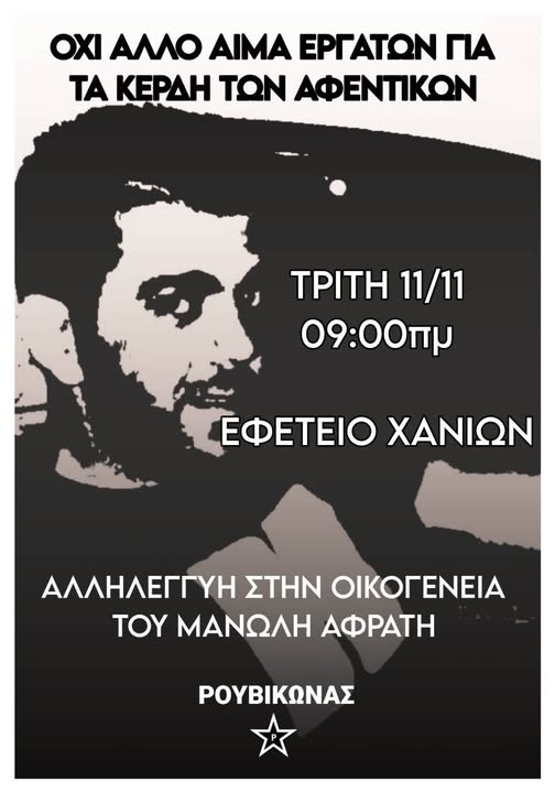 Η καπιταλιστική κιμαδομηχανή είναι αχόρταγη και τα θύματά της πληθαίνουν. Ανάμεσα στα εγκλήματα των ντόπιων αφεντικών συγκαταλέγεται και η δολοφονία Μανώλη Αφράτη πριν 5 χρόνια στην Κρήτη.