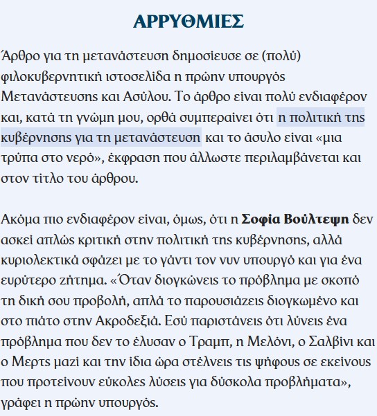 Υ.Γ2: Εναυσμα για την ανάρτηση αποτέλεσε σημερινό δημοσίευμα του “Βηματοδότη” που σχολιάζει την επίθεση που έκανε η πρώην υφυπουργός Μετανάστευσης και Ασύλου, Σοφία Βούλτεψη στην κυβέρνηση και στον Θάνο Πλεύρη για την πολιτική που εφαρμόζεται στο μεταναστευτικό.