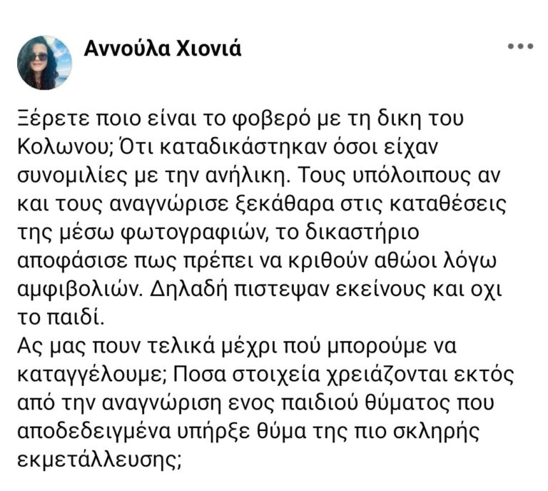 Μήπως σας έρχεται στην μνήμη σας τα όσα σοκαριστικά μάθαμε ότι έγραφε η μητέρα της δωδεκάχρονης σε μήνυμα της στον παιδοβιαστή Μίχο, απ’ τα οποία προκύπτει ότι ο μαστροπός πήγαινε το παιδί σε κάποια εκκλησία και το βίαζε ένας παπάς; Η μητέρα της ανήλικης εμφανίζεται να γράφει στον Μίχο: «κλαίω όλη νύχτα. Θα πάθει η καρδιά μου, που έπαιρνες το παιδί και το πήγαινες στον ανώμαλο στον Άγιο Α. (αναφέρει το όνομα της εκκλησίας) Θα σου φάω το λαρύγγι». Πώς και δεν μάθαμε το όνομα του παπά;