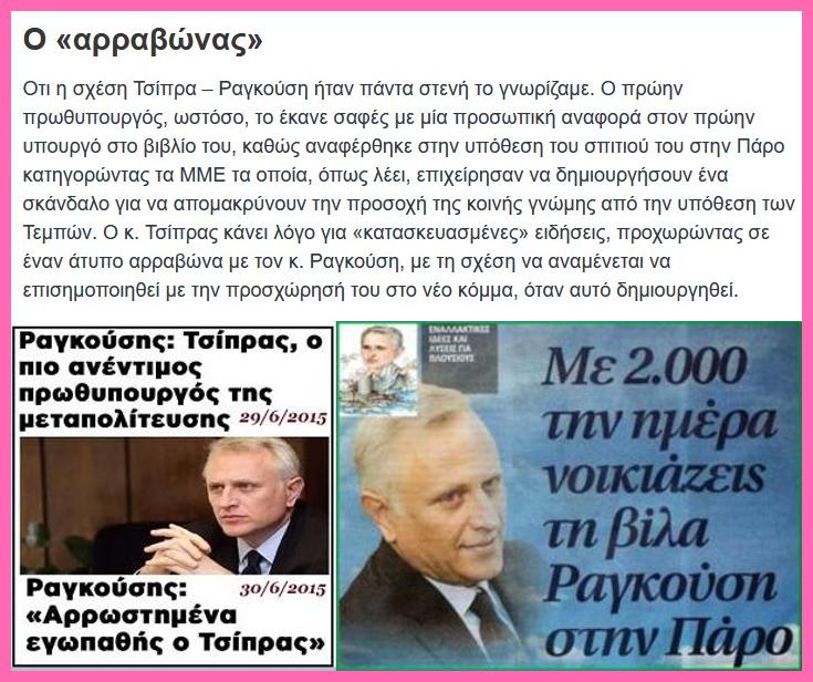 Διαβάζοντας το παραπάνω σχόλιο που υπάρχει στην σημερινή “Καθημερινή” και το οποίο μας ενημερώνει για τον “άτυπο αρραβώνα”, μεταξύ Ραγκούση και Τσίπρα, ανατρέξαμε στο αρχείο μας. Απ’ αυτό ανασύραμε περασμένες δηλώσεις του πρώην “κηπουρού του Γιωργάκη” ή του «μπιφτεκά της Πάρου», όπως αποκαλούσαν σκωπτικά τον Γ. Ραγκούση, αρκετοί πρώην συνάδελφοι του, όταν ο σημερινός “αρραβωνιαστικός” του πρώην υπουργού, ήταν ο πιο “ανέντιμος πρωθυπουργός της μεταπολίτευσης” και ένα άτομο “αρρωστημένα εγωπαθή”.