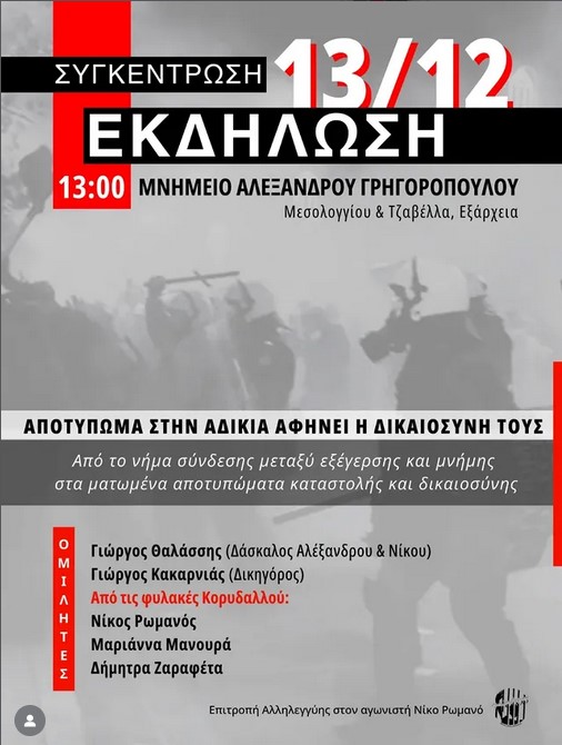Ως Επιτροπή αλληλεγγύης στον αγωνιστή Νίκο Ρωμανό διοργανώνουμε την εκδήλωση και παράλληλα καλούμε όλες τις δυνάμεις του κινήματος και του λαού, τις συλλογικότητες, τις οργανώσεις, τις ομάδες, τους ταξικούς φορείς σε μαζική συγκέντρωση στο μνημείο του 15 χρονου αναρχικού Αλέξανδρου Γρηγορόπουλου στον ιστορικό πεζόδρομο της Τζαβέλλα και Μεσολογγίου, για την υπεράσπιση της συλλογικής μνήμης και του αγώνα, απέναντι στη βεβήλωση και την καταστολή που επέβαλλε ο κρατικός μηχανισμός τη φετινή 6 Δεκέμβρη του 2025. Τα ΜΑΤ περνώντας μέσα από το μνημείο στις 16.00, στρατοπέδευσαν σε όλες τις γωνίες των οδών Τζαβέλλα και Μεσολογγίου, όπου ο κόσμος μαζικά πέρναγε να αφήσει λουλούδια και να τιμήσει τη μνήμη του Αλέξανδρου. Η κυβέρνηση επέλεξε ως κεντρικό κρατικό σχεδιασμό να βάλει τους δολοφόνους του Αλέξανδρου να είναι περιμετρικά στο μνημείο την προγραμματισμένη ώρα που ξεκινάει η προσυγκέντρωση για τη διαδήλωση στις 18.00 στα Προπύλαια.