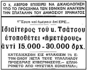 Το προβληματικό είναι ότι δυστυχώς δεν υπάρχουν ψηφιοποιημένα τα φύλα του Ριζοσπάστη για να μάθουμε τις αποκαλύψεις που έκαναν τότε οι δημοσιογράφοι της “εφημερίς της άκρας αριστεράς”, όπως έγραψε στην “απολογία” του, ο τότε υπουργός Εξωτερικών της κυβέρνησης της ΕΡΕ -και κατοπινός αρχηγός της Νέας Δημοκρατίας- Ευάγγελος Αβέρωφ. Το μόνο που πληροφορούμαστε από το κείμενο του ίδιου είναι ότι “εδημοσίευσεν απόρρητον κατάλογον συνοδεύοντα γνωστάς εκθέσεις δικαστικών και παραθέτουσα ονόματα και αντίστοιχα ποσά ωμίλησε περί ενός ολόκληρου κόσμου αποκαλυπτόμενου τροφίμου μυστικών κονδυλίων”.