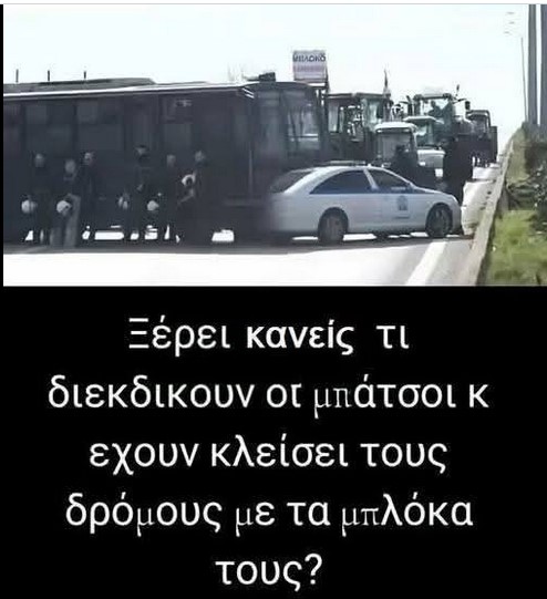 Οδηγοί προς αστυνομικούς:"Οι αγρότες κλείνουν τον δρόμο ή εσείς?Μας ταλαιπωρείτε σε όλο τον δρόμο.Δεν μας κλείνουν τον δρόμο οι αγρότες αλλά εσείς.Ανοίξτε τον δρόμο τώρα,τώρα.Ντροπή"!!