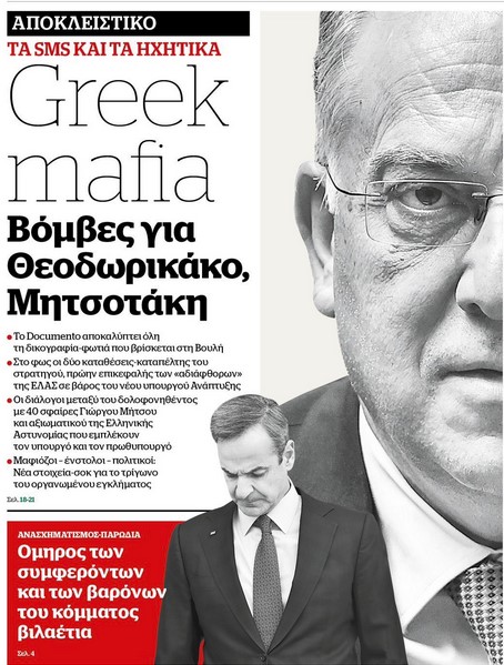 Όμως δεν είναι μόνο το συγκρότημα Μαρινάκη (ΜΟΛ) που έχει βγάλει στη φόρα τη σήψη της πολιτικής του διαδρομής. Το Documento κυκλοφόρησε με πρωτοσέλιδο που αναφερόταν σε συγκλονιστικά ντοκουμέντα, τα οποία περιλαμβάνονται σε δικογραφία που σαπίζει στα συρτάρια της Βουλής εδώ και μήνες. Αυτά αφορούν «αθέμιτες παρεμβάσεις» του τότε υπουργού Προστασίας του Πολίτη, Τάκη Θεοδωρικάκου, υπέρ επίορκων αστυνομικών συνδεδεμένων με το οργανωμένο έγκλημα.