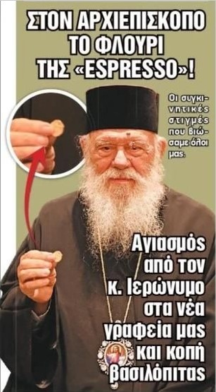 Σε μια εποχή που η οικονομική κρίση μαστίζει τα λαϊκά στρώματα, η ανεργία καλπάζει και η εκκλησιαστική περιουσία παραμένει αφορολόγητη, ο Μακαριώτατος Αρχιεπίσκοπος Αθηνών και πάσης Ελλάδος κ. Ιερώνυμος βρήκε χρόνο να “αγιάσει” τα νέα γραφεία της γνωστής κίτρινης φυλλάδας “Espresso”. Όχι μόνο τέλεσε τον αγιασμό, αλλά και το φλουρί της βασιλόπιτας έπεσε –τι σύμπτωση!– στον ίδιο, προκαλώντας “συγκινητικές στιγμές” στους παρευρισκόμενους, όπως μας ενημερώνει η πρώτη σελίδα του εντύπου.