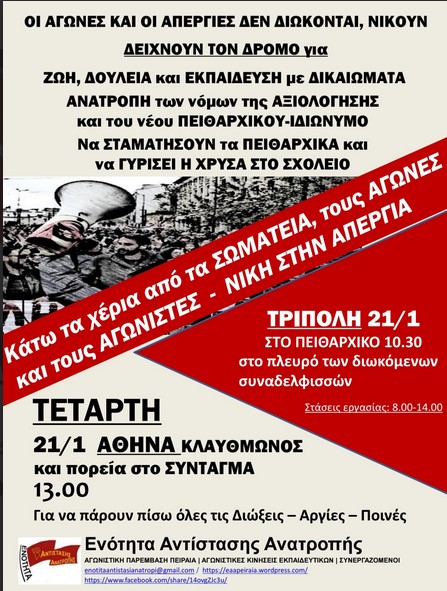 Στις 21 Γενάρη η εκπαίδευση στον δρόμο του αγώνα σε όλη τη χώρα!