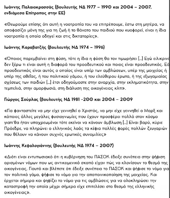 Και φυσικά όλοι οι νεοδημοκράτες τότε βουλευτές είχα ξεσαλώσει υπερασπιζόμενοι το τρίπτυχο “πατρίς – θρησκεία – οικογένεια”, ένα φασιστικό τρίπτυχο που υιοθετεί και η κ. Μαρία Καρυστιανού
