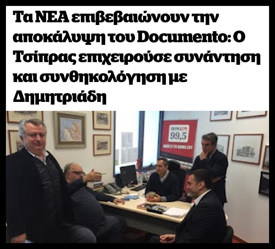 Ταυτόχρονα έχουμε και μια άλλη πολύ σοβαρή εξέλιξη. Tο Documento πανηγυρίζει σήμερα και θεωρεί δικαίωση του, ότι ο αρθρογράφος των ΝΕΩΝ, Γιώργος Παπαχρήστου εμφανίζεται να επιβεβαιώνει το δημοσίευμα του γράφοντας: “Εγκύρως, πιο έγκυρα δεν γίνεται, πληροφορήθηκα ότι όντως η προσέγγιση πραγματοποιήθηκε”, εννοώντας την προσπάθεια να ρθει σε επαφή η πλευρά Τσίπρα με τον Δημητριάδη.