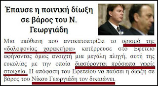 Κι όμως, διαβάζουμε στον ηλεκτρονικό αυτόν βόθρο ότι «η απόφαση του Εφετείου να παύσει τη δίωξη σε βάρος του Νίκου Γεωργιάδη τον δικαιώνει, μετά από τετραετή περιπέτεια, επιβεβαιώνοντας πως επρόκειτο για πολιτική δίωξη».