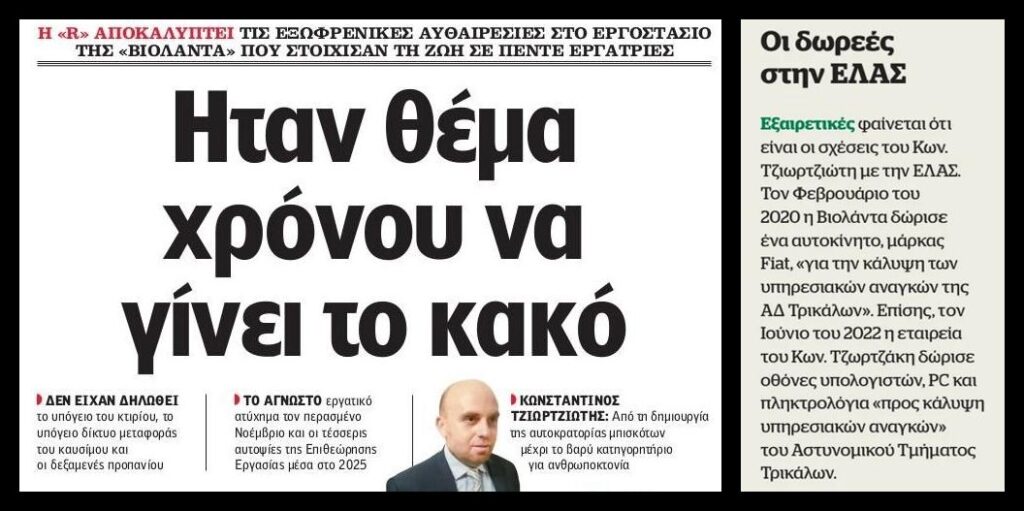 Δεν ήταν ούτε «ατυχία», ούτε «τραγική σύμπτωση», ούτε ένα μεμονωμένο εργατικό δυστύχημα. Όπως αποκαλύπτει η Realnews, το ομαδικό εργοδοτικό έγκλημα στο εργοστάσιο της ΒΙΟΛΑΝΤΑ ήταν θέμα χρόνου. Και ήταν θέμα χρόνου γιατί επί χρόνια η επιχείρηση ανεχόταν –και κάλυπτε– συνθήκες εργασιακού κάτεργου, οι οποίες είχαν ήδη καταγγελθεί.