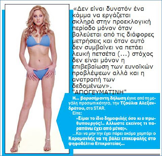 Κορόμηλο το δάκρυ της «Απογευματινής» γιατί οι υποψήφιοι βουλευτές της Ν.Δ έριξαν «λευκή πετσέτα» παραδεχόμενη την ήττα του κόμματος τους, ενώ ο Δ. Ρίζος εξακολουθεί να ρίχνει τα βέλη του στον Κ. Καραμανλή σαρκάζοντας τον γιατί δεν επέλεξε για το ψηφοδέλτιο Επικρατείας της Ν.Δ την … Τζούλια Αλεξανδράτου.
