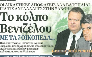 Στο δισέλιδο ρεπορτάζ της η εφημερίδα μιλούσε για “«Αρωμα» Μονής Βατοπεδίου αναδύει η υπόθεση με τα οικόπεδα στην Ξάνθη που έχει στην κυριότητα του ο κ. Βασίλης Βενιζέλος , πατέρας του σημερινού υπουργού Εθνικής Αμυνας καθώς το ιδιοκτησιακό τους καθεστώς χάνεται στην εποχή των κομιτατζήδων”.