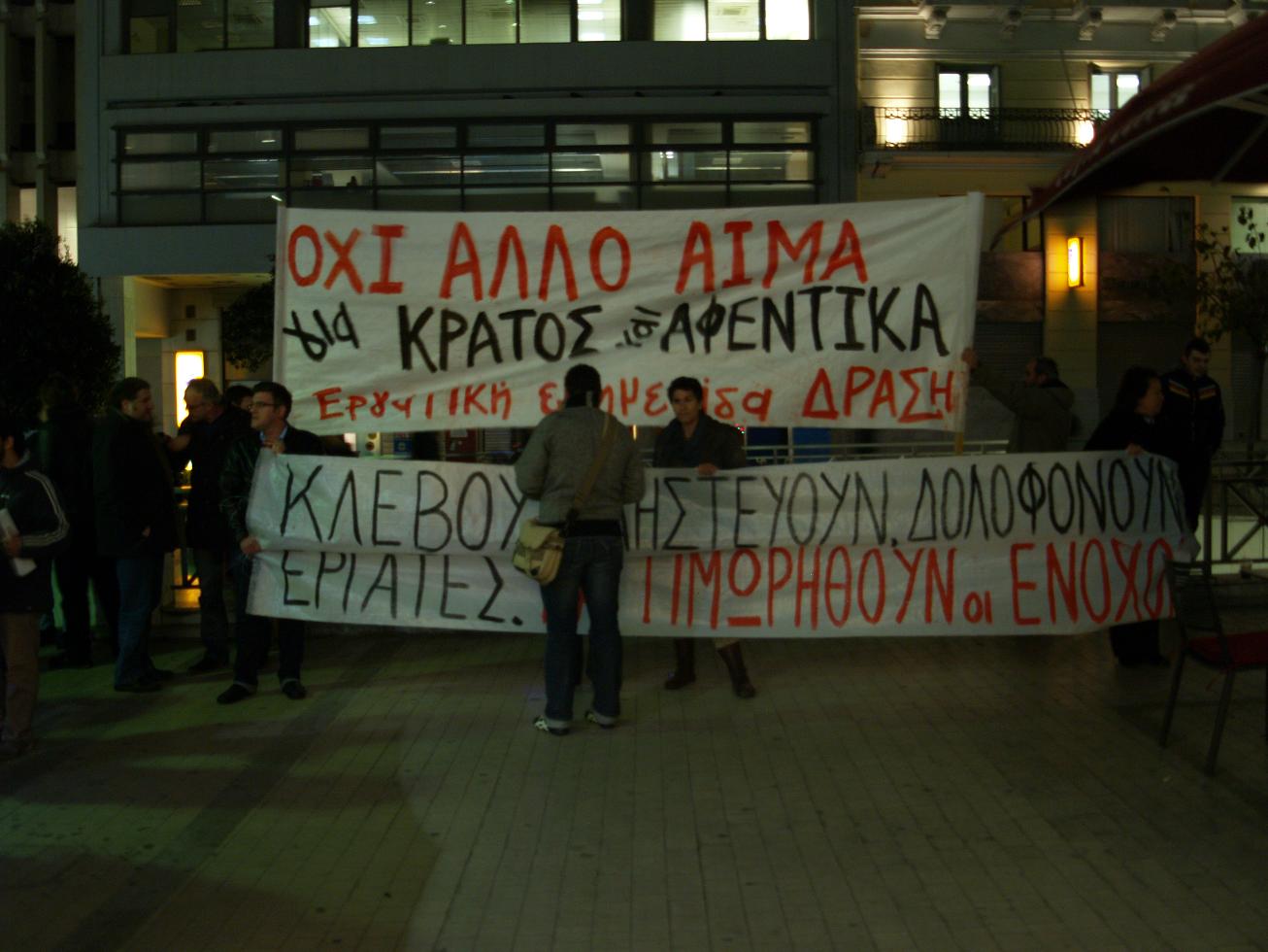 Την Τετάρτη 29 του μήνα 6 το απόγευμα πραγματοποιήσαμε συγκέντρωση διαμαρτυρίας για την δολοφονία του συναδέλφου μας Αζίζ Εμάντ που έχασε την ζωή του πέφτοντας από τον τρίτο όροφο ενώ καθάριζε τα τζάμια του κτηρίου της Γενικής Γραμματείας του Υπουργείου Εργασίας Διαχείρισης Κοινοτικών & άλλων Πόρων επί της Κοραή 4.