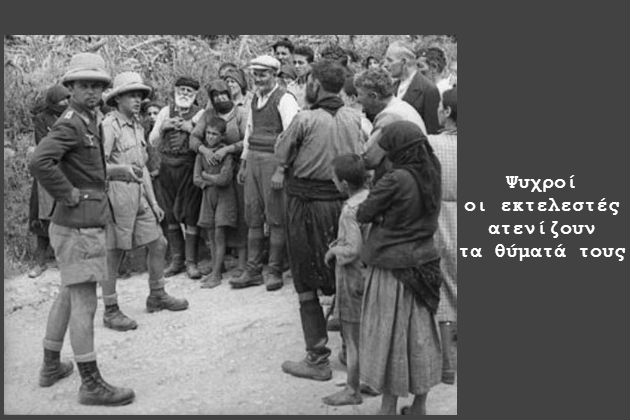 Δαμάστα (30): Εκτελέστηκαν στη θέση «Κερατίδι» Δαμάστας, στις 21 Αυγούστου 1944. Κλίνης Νικ. Γεώργιος, Κουγιουμουτζάκης Εμμ. Ανδρ., Κουγιουμουτζάκης Εμμ. Κων/νος, Κουγιουμουτζάκης Εμμ. Γεώργιος, Κουντούρης Σταύρου Εμμανουήλ, Κουντούρης Δημ. Νικ., Κρουσανιωτάκης Γεωργ. Ιωάννης, Κρουσανιωτάκης Νικ. Ιωάννης, Λιαδάκης Εμμ. Ιωάννης, Λιαδάκης Χρ. Κων/νος, Μαρούσης Δημ. Γεώργιος, Μαυράκης Στυλ. Εμμανουήλ, Μαυράκης Αλ. Νικόλαος, Μουντουφάρης Εμμ. Γεώργιος, Μουντουφάρης Παν. Ματθ., Νικολουδάκης Σωτ. Χαρίδημος, Νικολουδάκης Βασ. Γεώργιος, Παπαδάκης Βασ. Αναστάσιος, Περάκης Στ. Νικόλαος, Σαρρής Κων. Αριστόδημος, Σαρρής Δημ. Γεώργιος, Σαρρής Νικ. Γεώργιος, Σαρρής Γεωργ. Ευάγγελος, Σαρρής Γεωργ. Ιωάννης, Σαρρής Δημ. Μιχαήλ, Στρατιδάκης Αντ. Γεώργιος, Στρατιδάκης Αντ. Ιωάννης, Τριγώνης Στυλ. Εμμανουήλ, Τριγώνης Γεωρ. Ιωάννης, Τριγώνης Γεωρ. Ματθαίος