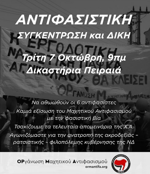 ΑΝΤΙΦΑΣΙΣΤΙΚΗ ΣΥΓΚΕΝΤΡΩΣΗ ΚΑΙ ΔΙΚΗ Την Τρίτη 7 Οκτωβρίου 9πμ στα Δικαστήρια Πειραιά (οδ. Σκουζέ) δικάζεται σε δεύτερο βαθμό η υπόθεση