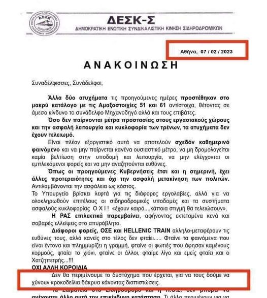 Σήμερα, μετά το δυστύχημα-έγκλημα, αυτή η ανακοίνωση των εργαζομένων κυκλοφορεί παντού. Είναι μάλλον η τελευταία, αλλά όχι η μοναδική φορά