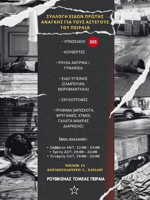 [Ρουβίκωνας τομέας Πειραιά] Συλλογή ειδών πρώτης ανάγκης για τους άστεγους του Πειραιά Το τελευταίο διάστημα, ο άστεγος πληθυσμός που βρίσκει