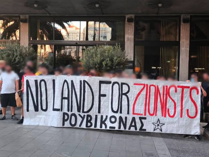 Ακολουθεί το κείμενο που μοιράστηκε κατά τη διάρκεια της παρέμβασης, σε ελληνικά και αγγλικά: «ΚΑΜΙΑ ΓΗ ΓΙΑ ΤΟΥΣ ΣΙΩΝΙΣΤΕΣ Ό,τι
