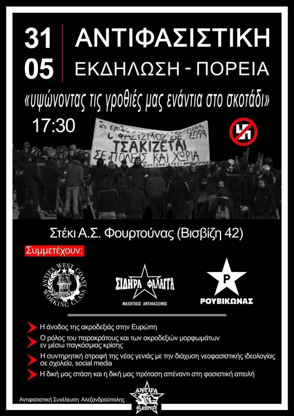 Διοργανώνεται από την Αντιφασιστική Συνέλευση Αλεξανδρούπολης Το Σάββατο 31 Μαΐου, μέλη του Ρουβίκωνα, ταυτόχρονα με την εκδήλωση ανοίγματός μας στη