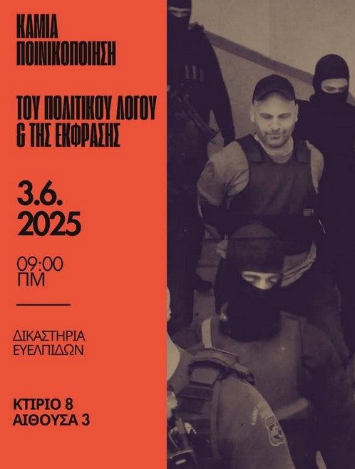 Την Τρίτη, 3 Ιούνη, δύο μέλη μας δικάζονται για δύο διαφορετικές υποθέσεις στα δικαστήρια της Ευελπίδων, στις 09:00. Στο κτίριο