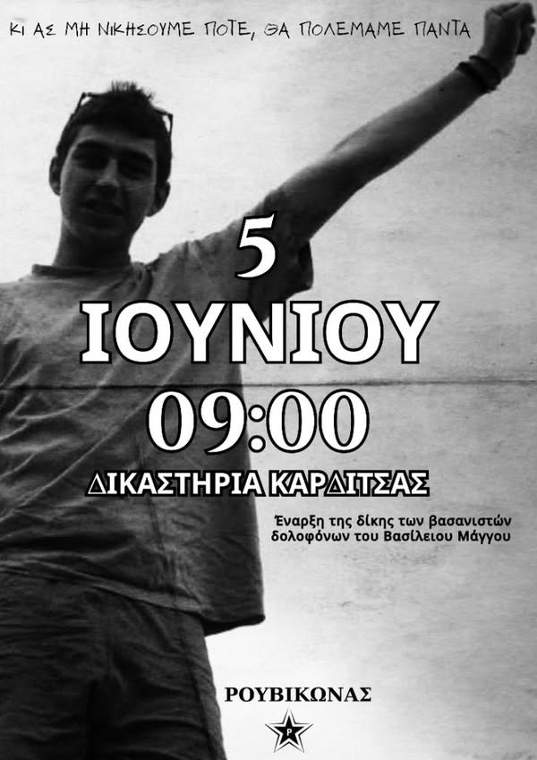 Πέμπτη, 5 Ιουνίου, στις 09:00, Δικαστήρια Καρδίτσας Έχουν περάσει 5 χρόνια από τότε που ο αγωνιστής Βασίλης Μάγγος ξυλοκοπήθηκε, απήχθη