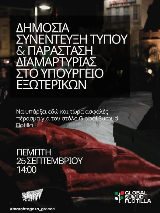 Δημόσια Συνέντευξη Τύπου & Παράσταση Διαμαρτυρίας στο Υπουργείο Εξωτερικών Πέμπτη 26 Σεπτεμβρίου, 14:00 Ο Global Sumud Flotilla, στον οποίο συμμετέχει