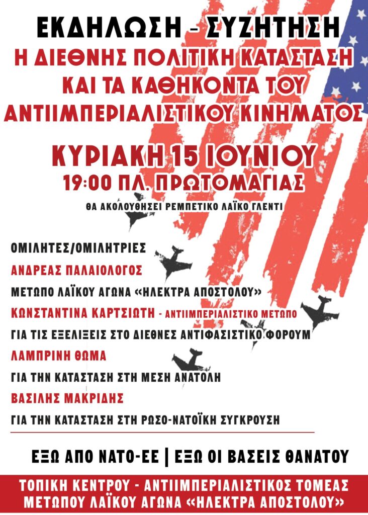 Κυριακή 15 Ιουνίου στις 19:00 Πλ. Πρωτομαγιάς Ως Μέτωπο Λαϊκού Αγώνα «Ηλέκτρα Αποστόλου» εκτιμούμε πως η περίοδος που βρισκόμαστε είναι
