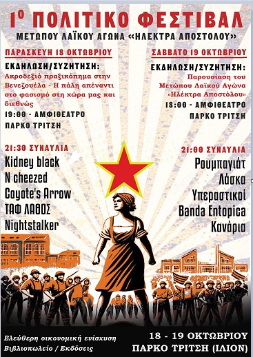 Λάβαμε και παραθέτουμε Το Μέτωπο Λαϊκού Αγώνα «Ηλέκτρα Αποστόλου» διοργανώνει διήμερο Πολιτικό Φεστιβάλ στις 18 και 19 Οκτωβρίου 2024, στο