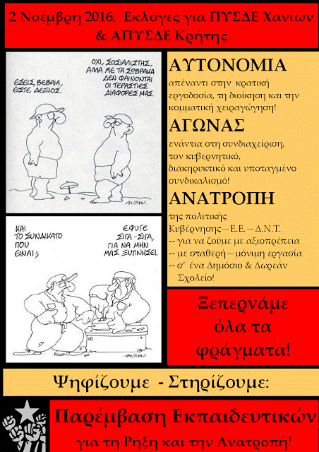 Όσον αφορά ιδιαίτερα στην ΕΛΜΕ Χανίων, μετά τις εκλογές που έγιναν στις 3 του Δεκέμβρη του 2015 το προεδρείο που συγκροτήθηκε από την ΑΝΤΑΡΣΥΑ (ΝΑΡ + ΣΕΚ), με την ουσιαστική στήριξη της ΛΑΕ και την ανοχή του νέου κυβερνητικού συνδικαλισμού (ΣΥΝΕΚ) έχει επιβάλει μια αντιδημοκρατική λειτουργία στο σωματείο, μιας και συχνά αναβάλει χωρίς λόγο τις προγραμματισμένες συνεδριάσεις του ΔΣ, τις αποφάσεις τις ανακοινώνει μια βδομάδα μετά από τα γεγονότα, δεν στέλνει πριν τα κείμενα για συζήτηση στα μέλη του ΔΣ και γενικά αντικαθιστά τη λειτουργία των συνεδριάσεων με τηλεφωνικές συνεννοήσεις μεταξύ των παρατάξεων, όπως έγινε π.χ. με την επιλογή όσων θα πάνε στο εκπαιδευτικό συνέδριο ανάμεσα στην “Ενωτική Πρωτοβουλία”, την “Πρωτοβουλία-Παρέμβαση” και τα ΣΥΝΕΚ. Είναι περιττό βέβαια να τονιστεί πως αποτέλεσμα αυτής της τακτικής είναι η αποσυσπείρωση, όπως αυτή αποτυπώνεται από την αποχή των συναδέλφων στις ΓΣ και την απροθυμία συμμετοχής τους στις στάσεις εργασίας που εξαγγέλλονται. Εμείς από τη μεριά μας θέλουμε την ΕΛΜΕ ζωντανή και δραστήρια, με μαζικές-μαχητικές διαδικασίες βάσης, ικανή να οργανώνει και να συντονίζει τους αγώνες και τη δράση των εκπαιδευτικών οικοδομώντας την αγωνιστική τους ενότητα.