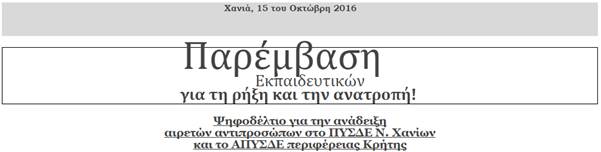 Η συμμετοχή της “Παρέμβασης Εκπαιδευτικών για τη Ρήξη και την Ανατροπή” στις εκλογές για το ΠΥΣΔΕ Χανίων και το ΑΠΥΣΔΕ περιφέρειας Κρήτης γίνεται χωρίς αυταπάτες για το χαρακτήρα αυτών των οργάνων. Τα Υπηρεσιακά συμβούλια δεν εξυπηρετούν τα συμφέροντα των εκπαιδευτικών. Πρόκειται για όργανα διαχείρισης και προώθησης της κυβερνητικής πολιτικής και η παρουσία των αιρετών δεν αλλάζει τον ρόλο αυτό. Όμως μπορεί να ταράζει τα λιμνάζοντα ύδατα με την παρέμβαση του εκπαιδευτικού κινήματος.