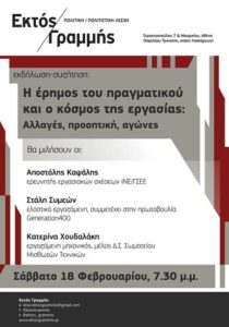 Η Πολιτική – Πολιτιστική Λέσχη Εκτός Γραμμής διοργανώνει το Σάββατο 18 Φεβρουαρίου, 7:30 μ.μ. εκδήλωση – συζήτηση με θέμα