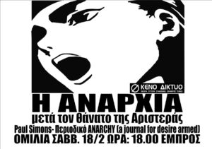 Η ΑΝΑΡΧΙΑ μετά τον θάνατο της Αριστεράς / Ομιλία του Paul Z. Simons (ΗΠΑ)- περιοδικό Anarchy & Κενό Δίκτυο Σαββ.18/2 ΕΜΠΡΟΣ ώρα 18.00