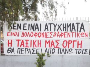 Δεν είναι ατυχήματα, είναι εγκλήματα των μεγάλων κατασκευαστικών εταιρειών που ενώ παίρνουν εκατομμύρια ευρώ για ένα έργο δεν δίνουν δεκάρα για την ζωή αυτών που τα παράγουν. Είναι εγκλήματα της κυβέρνησης ΣΥΡΙΖΑ ΑΝΕΛ και των προηγούμενων κυβερνήσεων που με τους αντεργατικούς νόμους καταργούν τις συλλογικές συμβάσεις εργασίας που καθορίζουν τα μέτρα ασφαλείας και δημιουργούν ένα πλαίσιο προστασίας για την εργοδοσία που εγκληματεί σε βάρος της ζωής και της ασφάλειας. Είναι αποτέλεσμα των νέων μορφών εργασιακών σχέσεων που βαφτίζουν τους εργαζόμενους εργοδότες με τα μπλοκάκια και δεν καλύπτονται από καμιά εργατική νομοθεσία, κανένα ωράριο. Αυτά τα μέτρα επιδεινώνονται με την νέα συμφωνία που υπογράφει η κυβέρνηση με τους εκπροσώπους ιμπεριαλιστών της Ευρωπαϊκής Ένωσης και των ΗΠΑ, στον βωμό της ανάπτυξης της κερδοφορίας του κεφαλαίου, για την ανάπτυξη της οικονομίας.