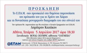 Την Τετάρτη 5 Απριλίου (18.00-21.30) θα πραγματοποιηθεί στο ξενοδοχείο Olympic Royal (περιοχή Μακρυγιάννη, απέναντι από τους στύλους του Ολυμπίου Διός), ομιλία του ΓΓ του ΕΠΑΜ Δ. Καζάκη για το Χρέος και γιατί μπορεί να διαγραφεί.