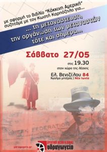Με αφορμή, το βιβλίο του Κωστή Καρπόζηλου «Κόκκινη Αμερική. Έλληνες μετανάστες και το όραμα ενός Νέου Κόσμου 1900-1950», το Σάββατο 27 Μάη και ώρα 7.30 μ.μ., θα πραγματοποιηθεί συζήτηση-εκδήλωση με θέμα τη μετανάστευση και την οργάνωση των μεταναστών από τις αρχές του προηγούμενου αιώνα ως σήμερα, στο χώρο της Εργατικής Λέσχης Νέας Ιωνίας-υδραγωγείο, Ελ. Βενιζέλου 84, Άγαλμα Μητέρας.