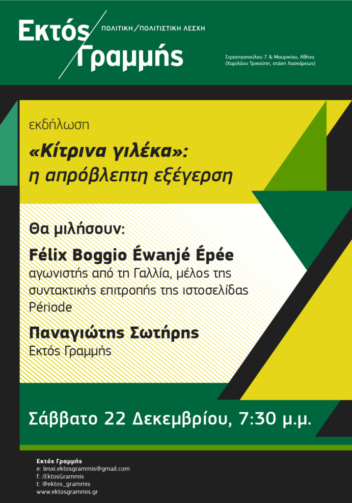 Εκδήλωση: «Κίτρινα γιλέκα»: η απρόβλεπτη εξέγερση / Σάββατο, 22/12, 7:30 μ.μ.