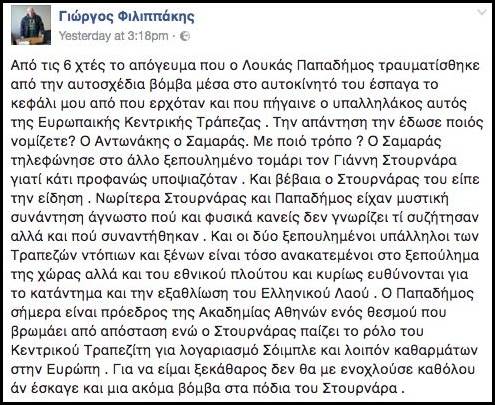 Να θυμίσουμε ότι το 2017 όταν έγινε μια επίθεση με παγιδευμένο φάκελο στον Λουκά Παπαδήμο ο Γιώργος Φιλιππάκης φέρεται να έχει κάνει -είναι μια κάπως περίεργη ιστορία- μια ανάρτηση στο Facebook, όπου ανάμεσα στα άλλα ανέφερε: «δεν θα με ενοχλούσε καθόλου αν έσκαγε και μια ακόμα βόμβα στα πόδια του Στουρνάρα».