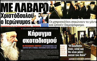 Απ’ τα κεντρικά θέματα της σημερινής ειδησεογραφίας ήταν το μακροσκελέστατο τροπάρι που έψαλε χτες ο Ιερώνυμος στους ομοτράπεζους του στην «Ιερά» Σύνοδο. Τα δημοσιεύματα μας λένε ότι «στην πολυσέλιδη εισήγησή του ο κ. Ιερώνυμος αναφέρθηκε σε όλο το πλέγμα των σχέσεων εκκλησίας και κράτους από την εποχή της Οθωμανικής Αυτοκρατορίας μέχρι και σήμερα» και ανάμεσα στα άλλα τόνισε: «Τα κόμματα της Αριστεράς με τη γνωστή φιλοσοφικο-κοινωνική βιοκοσμοθεωρία του κομμουνιστικού κοσμοειδώλου, όπως γνώρισε τον χωρισμό αυτός ο καταρρεύσας υπαρκτός σοσιαλισμός στο ανατολικό μπλοκ, που στην ουσία ήταν ο διωγμός της θρησκευτικής πίστεως, ελαύνονται από αποτυχημένα αθεϊστικά ιδεολογήματα και συναντώνται με τα υπόλοιπα κόμματα του νεοφιλελεύθερου χώρου κάτω από τις ντιρεκτίβες της νέας εποχής και της νέας τάξεως».