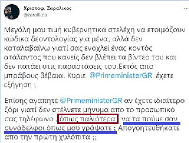 Οπως, λοιπόν μας είχε γράφει ο Ζαραλίκος ο Μητσοτάκης του έστειλε μήνυμα από το προσωπικό του τηλέφωνο τον αποκάλεσε συνάδελφο (!!!) και ζήτησε να τα πουν από κοντά. Ο δημοφιλής stand up comedian μας αποκαλύπτει ότι έριξε χυλόπιτα στον πρωθυπουργό. (Είναι κάτι που δεν διαψεύστηκε, αν και για τα ΜΜΕ θεωρήθηκε ότι δεν άξιζε ούτε ένα μονόστηλο)!