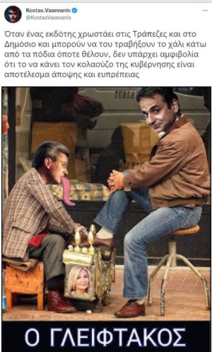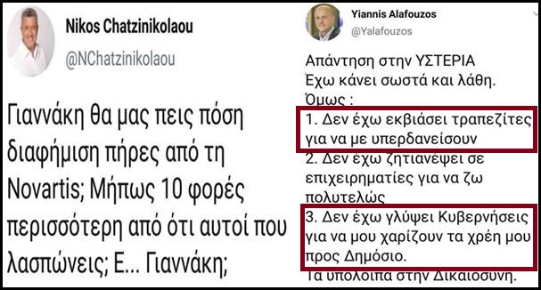 Πάμε στα τωρινά. Ο εκδότης δημοσιογράφος Νίκος Χατζηνικολάου έχει κατηγορηθεί δημόσια, από άλλον πλουτοκράτη, τον Γιάννη Αλαφούζου, ότι έχει εκβιάσει τραπεζίτες για να τον υπερδανίσουν και ότι γλύφει κυβερνήσεις για να του χαρίσουν τα χρέη του