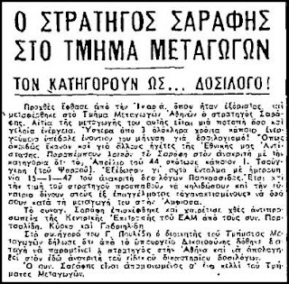 Προχτές έφτασε από την Ικαριά όπου ήταν εξόριστος και μεταφέρθηκε στο Τμήμα Μεταγωγών Αθηνών ο στρατηγός Στέφανος Σαράφης. Αιτία αυτής της μεταγωγής του ήταν μια ποταπή όσα και γελοία ενέργεια. Υστερα από τρία χρόνια κάποιο ενεργούμενο υπέβαλε εναντίον του μήνυση για δοσιλογισμό1 Οπως ακριβώς έκαναν και σε άλλους ηγέτες της Εθνικής μας αντίστασης.