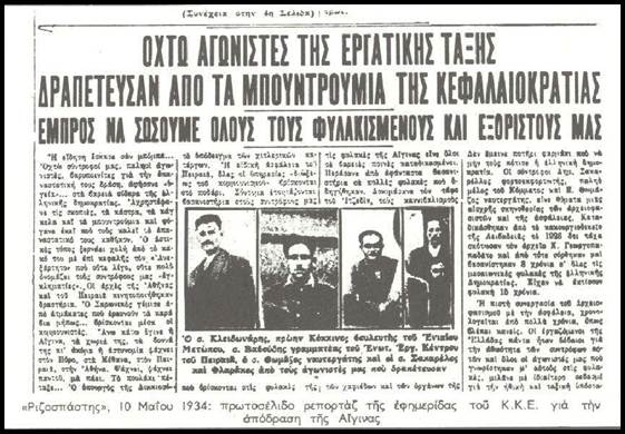 «Ή είδηση έσκασε σά μπόμπα… όχτώ συντρόφοι μας παληοί άγωνιστές, βαρυποινίτες γιά τήν έπαναστατική τους δράση, άφησαν “γειά” στά βαρειά σίδερα τής έλληνικής δημοκρατίας. ’Αχρηστέψανε τις σκοπιές, τά κάστρα, τά κάγγελα καί τά μπουντρούμια καί φύγανε έκεί πού τούς καλεί τό έπαναστατικό τους καθήκον. Ό άστικός τύπος ξερνάει τή χολή του μέ έπικεφαλής τόν “Ανεξάρτητο” πού ούτε λίγο, ούτε πολύ όνομάζει τούς συντρόφους μας “έγκληματίες”. Οί άρχές τής ’Αθήνας καί τού Πειραιά κινητοποιήθηκαν δραστήρια. Ό Σαρωνικός γέμισε άτμάκατες πού έρευνούν τά καράβια μήπως… βρίσκονται μέσα οί κομμουνιστές. Ανω κάτω έγινε ή Αίγινα, τά χωριά της, τά βουνά της κι άκόμα ή άστυνομία ψάχνει στόν Πόρο, στά Μέθανα, στόν Πειραιά, στήν ’Αθήνα. Ψάχνει, ψάχνει παντού, μά πάει, τό πουλάκι πέταξε…».