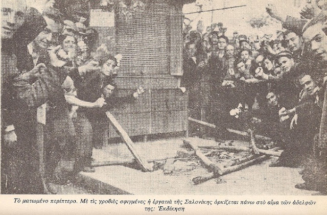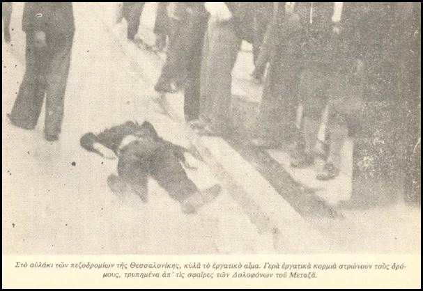 Το τι επακολούθησε δεν περιγράφεται. Τα αποσπάσματα που παραφύλαγαν στις γύρω παρόδους της οδού Εγνατίας, οι χαφιέδες που ’χαν τοποθετηθεί σ’ επίκαιρες θέσεις στα γύρω μέγαρα, οι «Ακίνητοι» χωροφύλακες, όλοι  ανοίγουν πυκνή φωτιά κατά του λαού. Ο ένας μετά τον άλλο στρώνονται χάμω οι νεκροί και δεκάδες τραυματίες ζητούνε βοήθεια.