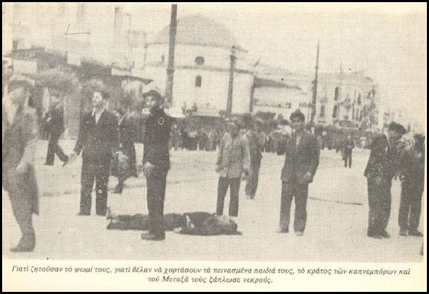 Οι κυβερνητικές εφημερίδες πάλι χύνουνε δάκρυα υποκριτή για τον αδικοσκοτωμό εργαζόμενων ανθρώπων, που ζητούσανε οικονομική βελτίωση της θέσης τους. Ρίχνουνε την ευθύνη στ’ αστυνομικά όργανα -στα κατώτερα αστυνομικά όργανα –  για ν’ αποπειραθούνε να τα δικαιολογήσουνε αμέσως, με περισσότερη σιγουριά: