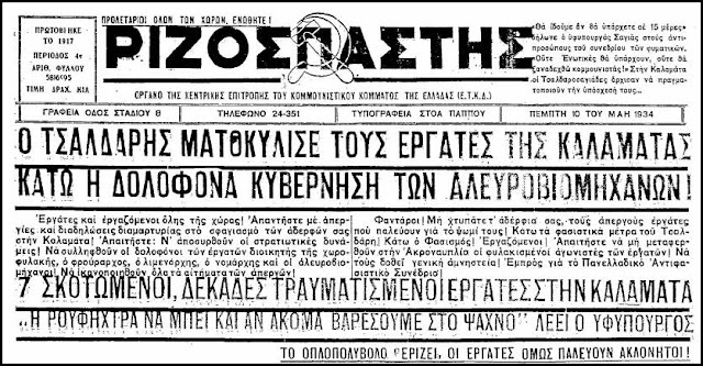 «Τα λιθόστρωτα της Καλαμάτας βάφτηκαν με αίμα εργατικό. Τα πολυβόλα του Τσαλδάρη ρίξανε αμέτρητες σφαίρες στα βασανισμένα κορμιά των λιμενεργατών, των μυλεργατών που κατέβηκαν στην απεργία για να διακηρύξουν: “ΔΕΝ ΘΕΛΟΥΜΕ ΝΑ ΠΕΘΑΝΟΥΜΕ ΑΠΟ ΤΗΝ ΠΕΙΝΑ”. Άγνωστος είναι ο πραγματικός αριθμός των δολοφονημένων, αν και πληροφορίες αναφέρουν πως ξεπερνάνε τους δέκα. Πολλές δεκάδες είναι οι τραυματισμένοι… Ετσι ο δολοφόνος Βενιζέλος που σκότωσε πέρυσι τους εργάτες της Σαλονίκης και της Νάουσας δεν μπορεί να καυχιέται πώς είναι ο μονος δήμιος των εργαζομένων. Ο Τσαλδάρης παρουσιάζεται αντάξιος συνεχιστής του.