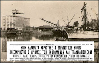Αυτήν την όψιν παρουσίαζον αι Καλάμαι, όψιν πόλεως τελούσης εις κατάστασιν πραγματικής επαναστάσεως, με τους λιμενεργάτας και μυλεργάτας από το ένα μέρος εις απεργίαν ευνοουμένην από ολόκληρον τον λαόν, και από το άλλο μέρος τον στρατόν και την χωροφυλακήν επιτιθεμένην και τρομοκρατούσαν…”. ,,,
