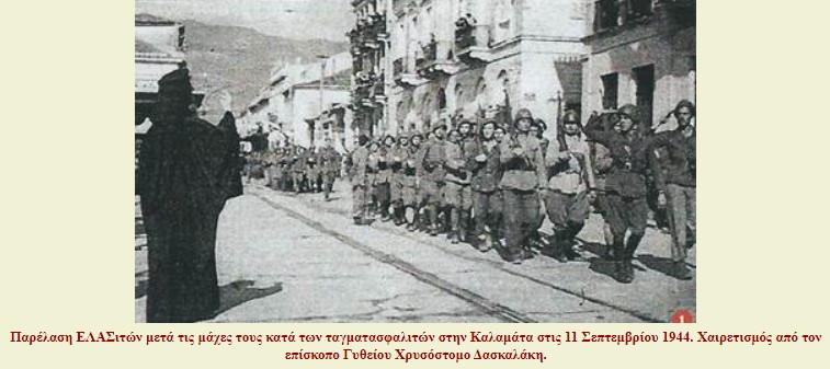 Κατά τις μέρες πριν από την Απελευθέρωση, όταν οι γερμανικές δυνάμεις αποχωρούσαν από τη νότια Ελλάδα, οι εκκαθαριστικές επιχειρήσεις του ΕΛΑΣ ενάντια στα Τάγματα Ασφαλείας της νότιας και δυτικής Πελοποννήσου έχουν μείνει χαραγμένες στη μνήμη πολλών. Αιματηρές υπήρξαν οι μάχες σε διάφορες περιοχές όπου είχαν περιχαρακωθεί ταγματασφαλίτες (Πύργος, Γαργαλιάνοι, Αχλαδόκαμπος, Μυστράς κ,ά.) 9.