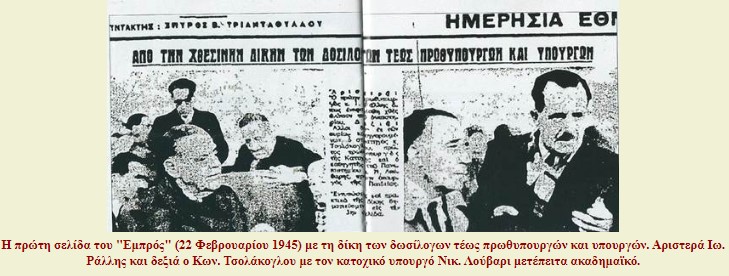Στο Ειδικό Δικαστήριο Δωσίλογων Αθήνας (κτίριο της οδού Σανταρόζα) η πρώτη δίκη των δωσίλογων πρωθυπουργών, μεταξύ των οποίων και ο Ράλλης, στη θητεία του οποίου ιδρύθηκαν τα Τάγματα Ασφαλείας, ξεκίνησε στις 21/2/1945 και διήρκεσε έως τις 31/5/1945.